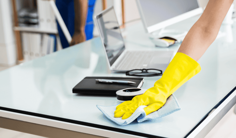 Bureaux et mobiliers : dépoussiérage, essuyage et désinfection des zones de contact ;